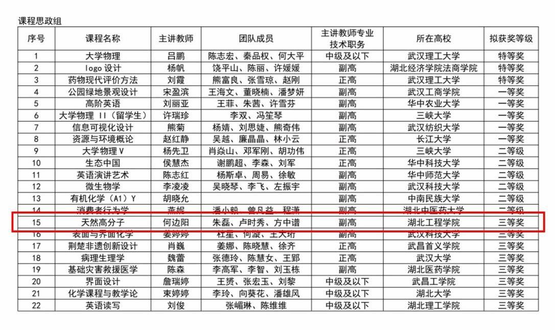 5月23日至25日,由湖北省教育厅指导、湖北省高等教育学会主办的第五届湖北省高校教师教学创新大赛现场赛在武汉理工大学举行,公司何边阳教师团队《天然高分子》课程荣获课程思政组三等奖。