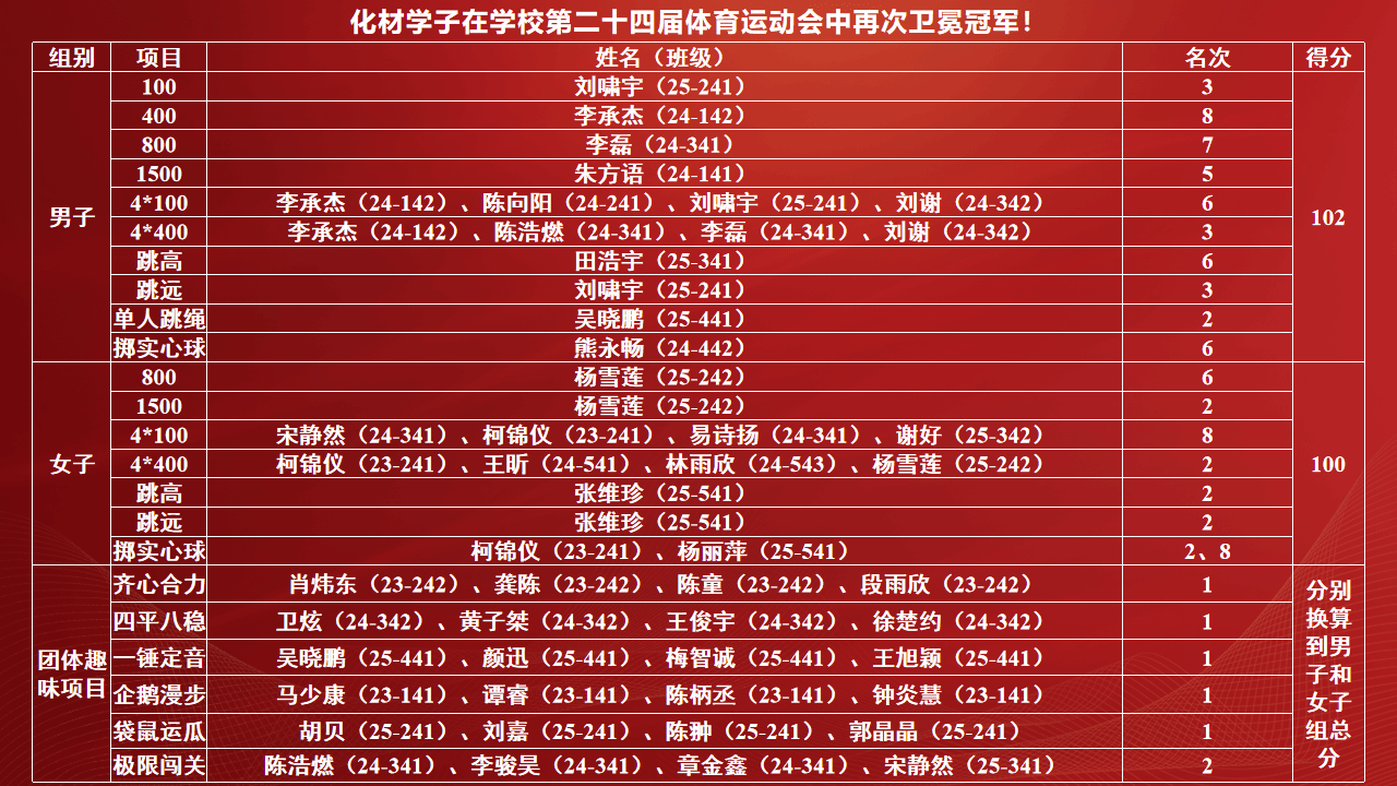 阳光明媚,风和日丽。11月13至14日,tyc33455cc第二十四届体育运动会在东区运动场举行。公司共派出60名运动员参赛,在多个项目中展开激烈角逐,展现了“更高、更快、更强、更团结”运动精神,最终公司学子斩获男子总分第三、女子总分第一、团体总分第一,获评体育道德风尚奖,再次卫冕。